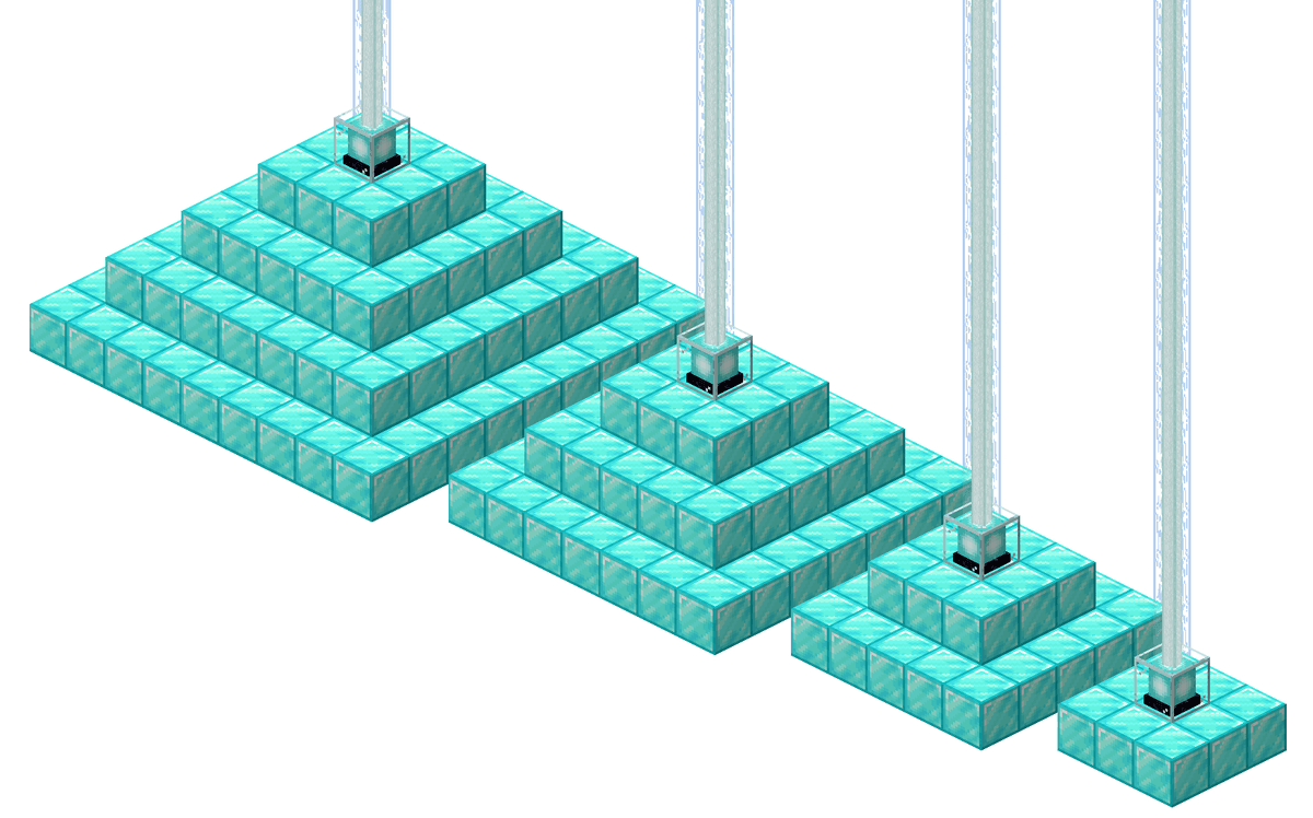 Pyramiden können auch für mehrere Leuchtfeuer verwendet werden, erfordern aber einen größeren Pyramidenradius, der aus mehr Blöcken und Ressourcen besteht, um ihrer außergewöhnlichen Stärke gerecht zu werden.